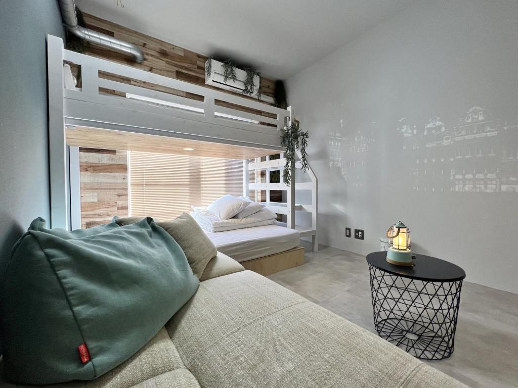 We enjoyed our stay comfortably. My elementary school son was very happy and said he loved the room with the white bunk beds! The next morning, the whole family had fun at the bouldering area in the shared space. The atmosphere of the entire building, the coziness of the shared space, and the abundance of manga and books were all excellent. There are also convenience stores and bakeries within walking distance, which was convenient. The staff were kind as well. It’s a very comfortable and nice place to stay.